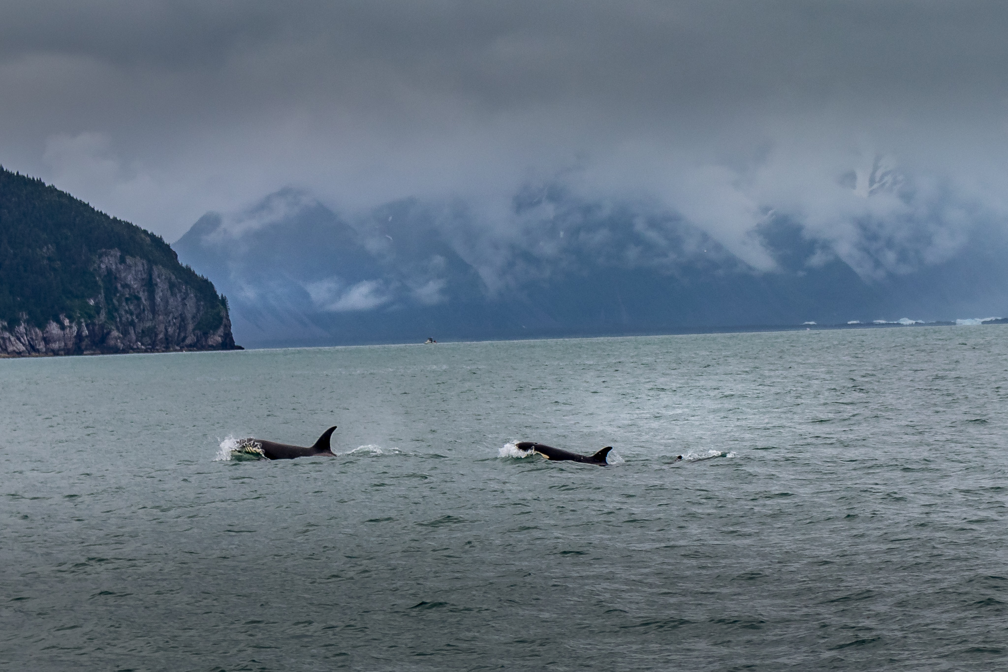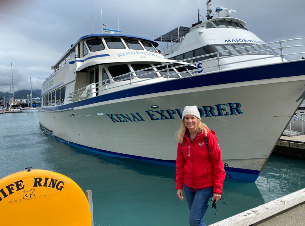 Once in Seward, we hopped on a Kenai Fjords Tours boat for a day cruise.  This is the second time we’ve booked with Kenai and they do an excellent job.  Last time we went on a short boat ride and had so much fun, this time I booked us for a six-hour tour.  It was a cold raining day but I still couldn’t resist freezing while standing on the bow of the boat as we bounced over the rolling swells. We first visited Fox Island, which was named to entice fox farming in Alaska.  That didn’t quite work out but the Island is now a local tourist destination offering lunch. Salmon cakes, yum! Afterward we walked along a shoreline covered with shale like skipping rocks.  Having finished, we all scrambled back to the boat ready for sightseeing. We saw more bald eagles and were enjoying cute little puffins when someone sighted two slim line black fins gliding through the water – Orcas!  We followed them for a bit when the captain got a call from another boat about a pod of humpbacks. Reeving up the engines we took off to find whale spouts. There was a Momma and a baby swimming behind another eight or so whales.  At one point, their heads came up right in front of the boat!  These are some of the largest mammals on earth weighing in at 50 tons and up to 50 feet long.  Hint: If you look for where the birds are congregating, you can usually know where the whales are hiding under the water.