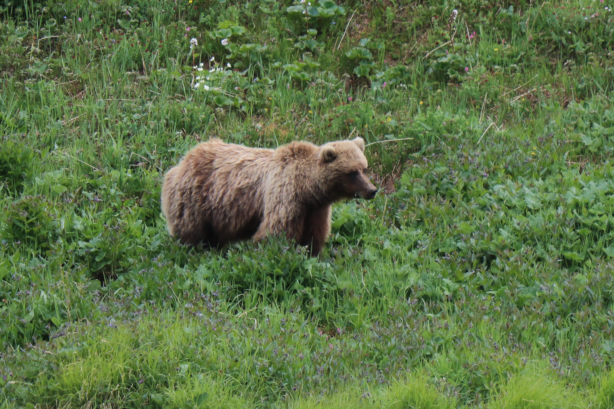 You can book bus tours deeper into the Park with varying lengths of time.  We selected the eight- hour tour and while that seems like a long time, it didn’t feel like it, giving us about six hours in the actually Park.  All along the way, Brian, our guide who is a trained botanist, stopped and explained park conservation, the animals and the names and medicinal uses of the flowers.  We were lucky enough to have another gorgeous day and we’re able to see all of Denali. This only happens about a few days a year so definitely buying a lotto ticket soon.  We saw bears, Dahl sheep, elk, a moose and a marmot.