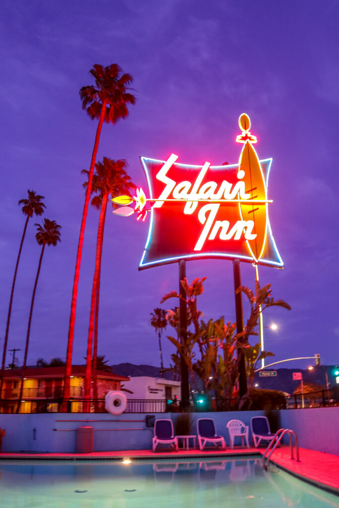 There are a few boutique hotels in Burbank and two of these have a very retro style.  For a full list, go to Visit Burbank. For our staycation, we selected the Safari Inn.  It was built in 1955 and hosted a slew of shows including Apollo 13, True Romance, Lethal Weapon 3, Parenthood, The Closer, Coach Carter, the Partridge Family, Six Feet Under, Desperate Housewives and more. I love the drive-under-the-patio entrance and the neon sign.  The rooms have been fully updated are nice.  I had packed a cooler of gin and tonic mixings, which we drank by the pool as we took photos. The next hotel on my staycation list is the Tangerine, another retro-style hotel in Burbank.