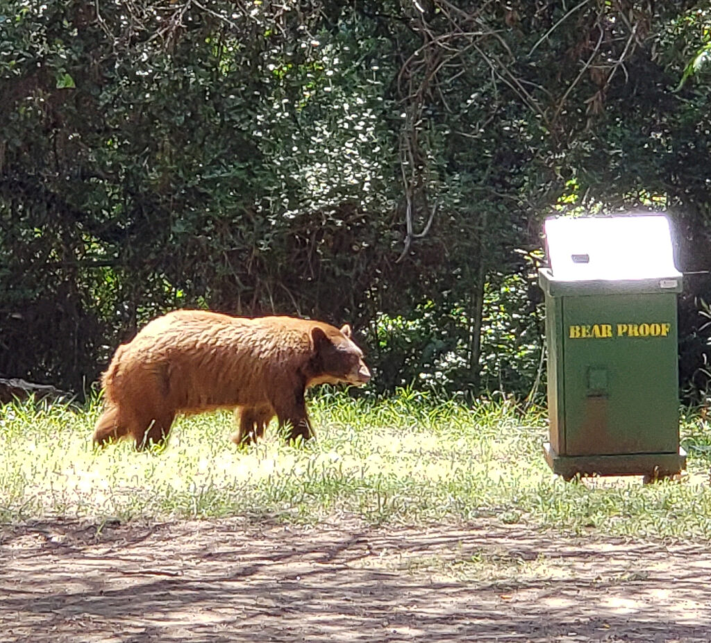 On this hike, you will enjoy the many trees and heavy vegetation along the path following the adjacent stream.  The Canyon is beautiful.  There is one area where the path becomes narrow for people passing each other but there is room to stand to the side if you plan for it.  At the end is a beautiful waterfall.  We have gone twice in June and the water was still running.  The hike is popular so plan on other people and pups along the route.  The second time we grilled some hotdogs in the park and a bear showed up not 25 yards from us to dig into trash left by other picnickers.  He wasn’t threating and didn’t appear afraid or agitated by people but to be on the safe side, we called the rangers and packed up.