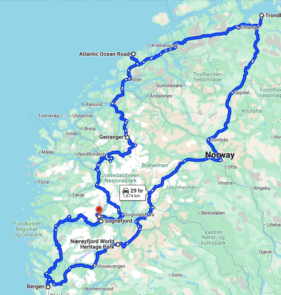 Our route took us north to Trondheim before looping back along a more southerly road. I tried to keep each day’s drive between three and four hours—just enough structure to make progress, but flexible enough to allow for scenic pull-offs, quiet villages, and those irresistible “let’s see where this goes” moments. One return stretch stretched to six and a half hours, but it never felt long. The views made sure of that. One highlight was the Fram Railroad, a one and a half hour train ride through tunnels, canyons and along ridges to see little town below and waterfalls.  I would highly recommend this. (If you are going south on the train, try to sit on the right side of the train in the front seats where the window goes down. You’ll thank me later. )