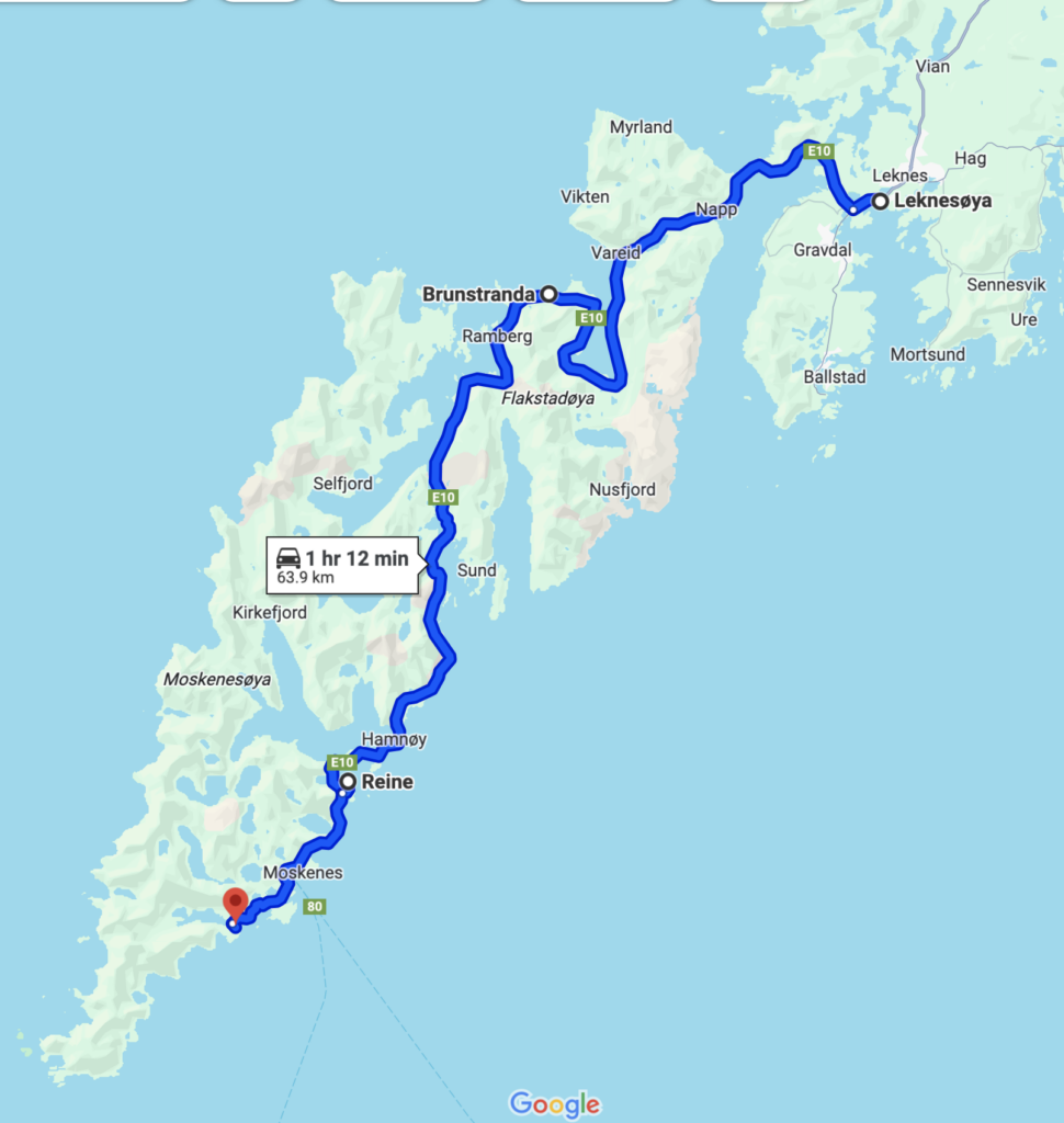 We flew into Oslo, then caught a connecting flight north to Bodø (pronounced Boo-duh). From there, we rented a car, took the three-hour ferry to Moskenes, and then drove about another hour to Leknes. There are places to stay closer to the ferry, but I intentionally chose to be farther from the cruise ship stops.